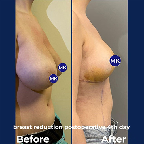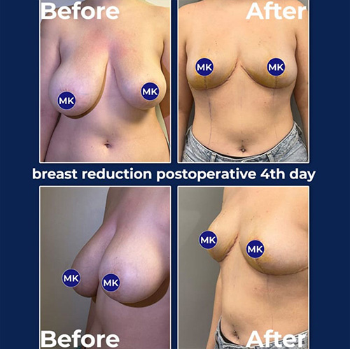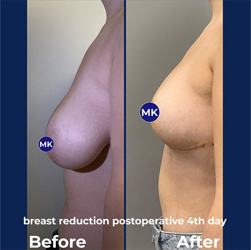 During breast reduction surgery, not only is excess tissue removed, but the breast is also reshaped and lifted. Therefore, after the surgery, the size is not just reduced; a more aesthetic and youthful breast form is achieved. The nipple is moved to its ideal position, symmetry is ensured, and a natural, proportional look to the body is obtained.